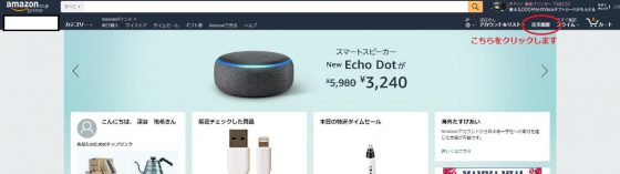注文履歴のページに行くにはAmazonのトップページの右上の方にある「注文履歴」をクリックします。