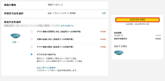 返送用のラベルを取得するので「返品用ラベルと返送手順を表示・印刷」を選択。