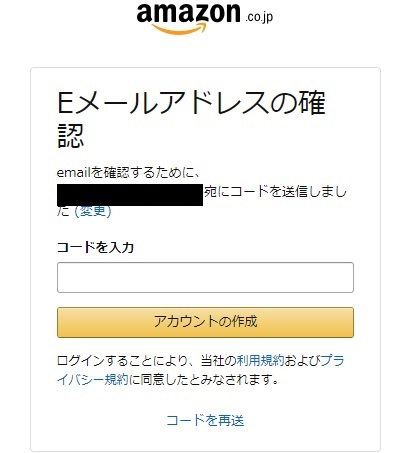 3.Amazonアカウントを作成ボタンを押すと、入力したメールアドレスに確認コードが送られてくるので、それをコピーして入力。